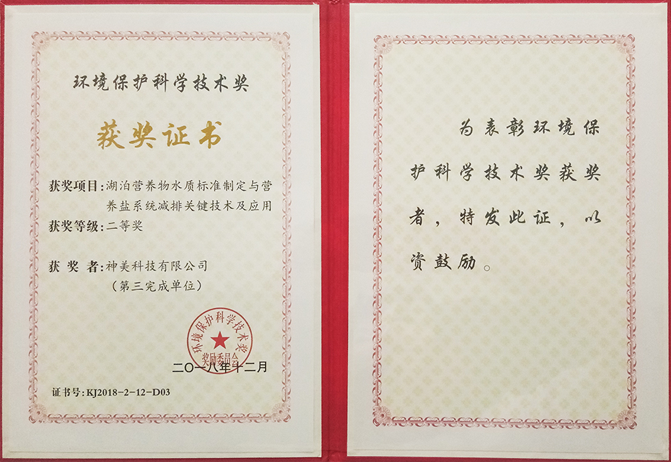 2019年初,根據(jù)國家環(huán)境保護科學(xué)技術(shù)獎勵委員會公布的環(huán)境保護科學(xué)技術(shù)獎評審結(jié)果,神美科技有限公司參與完成的科研項目“湖泊營養(yǎng)物水質(zhì)標(biāo)準(zhǔn)制定與營養(yǎng)鹽系統(tǒng)減排關(guān)鍵技術(shù)及應(yīng)用”榮獲二等獎。