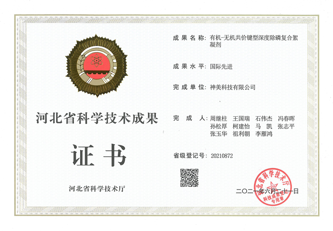 | 熱烈慶祝神美科技《有機-無機共價鍵型深度除磷復合絮凝劑》獲得河北省科技廳-科技成果鑒定“國際先進”! |