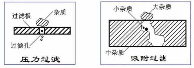 石英砂(或海砂)表面光滑且基本沒有空隙,因而截留懸浮物基本靠的是顆粒之間的縫隙,截流的雜質(zhì)很快堵塞流道,繼續(xù)過濾則形成污泥層,水流穿過逐漸加厚的污泥層會引起水頭升高或過濾壓力升高,對于實際過濾設(shè)備或過濾池的表現(xiàn)就是,反沖洗周期縮短,消耗較大的反沖水耗與能耗。 輕質(zhì)微孔陶瓷濾料表面幾乎被可見孔布滿,并且存在許多顯微孔,這些孔徑極易截留雜質(zhì),而雜質(zhì)的滯留并不影響顆粒之間的空隙,因而占用有效流道的時間要比傳統(tǒng)砂濾長很多,也就是反洗周期長。 四 微孔陶瓷過濾截留機理 下圖表示二種不同形式的過濾原理,傳統(tǒng)砂濾實際上是壓力機械阻擋為主,小孔截留大的雜質(zhì),過濾精度取決于表層沙粒的大小,例如,過濾罐實際裝填的濾料最小僅為0.5-1.2mm,而采用新型輕質(zhì)微孔陶瓷節(jié)能型微濾的機理是:除了機械阻擋以外,還兼有化學(xué)物理吸附,以渣濾渣等復(fù)合截留作用。用其制造的過濾設(shè)備有如下特點: ● 同比條件下,濾料直徑可以放大1~2個級別,例0.5mm的石英砂可以改為1~3mm的微孔陶瓷,這意味著提高了容垢量或延長了反沖洗周期。 ● 同比條件下降低了過濾壓降,而降低壓降就是節(jié)能,當用于壓力過濾罐時,大部分過濾周期中,進出水表觀壓降幾乎為零,實際壓降0.01Mpa~0.05Mpa。 ●由于比重輕(1.1g/cm3),容重也輕(0.6~0.7g/cm3),因而大大降低了反沖洗能耗,對采用大流量的微濾系統(tǒng)而言,無需專用的反洗水箱及大流量水泵,可不受傳統(tǒng)的水力沖洗原理約束,無需罐頂中心的攪拌器,同比節(jié)約80%的反沖洗用水和80%的反洗能耗。