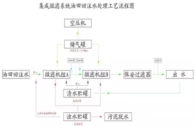 1 回注水處理一般是精處理階段,在進水的前面有一系列的前置處理工藝,典型的是大型沉降罐,以使得浮油上浮,因此,進入精處理的水質(zhì),一般油和懸浮物為30---50mg/L,但是不穩(wěn)定,波動的范圍較大。可以波動在100mg/L左右甚至更多。這樣就產(chǎn)生了技術(shù)難度,無論添加何種藥劑,都是采用計量泵定量注入,但是如果來水不穩(wěn)定,則定量的藥劑和不定量的水質(zhì)混合,其結(jié)果是出水指標不穩(wěn)定,因此,為了保持出水的穩(wěn)定性,設(shè)計了預(yù)處理工藝,由第一級微濾系統(tǒng)進行預(yù)處理,經(jīng)過預(yù)處理的水質(zhì)其懸浮物與油的含量穩(wěn)定,為后期加藥處理提供了良好的技術(shù)條件。 2 一號絮凝劑和二號絮凝劑為針對水質(zhì)而配置,針對含聚水質(zhì)和其他水質(zhì)而不同,然后再次經(jīng)過微濾系統(tǒng)徹底濾除各種懸浮物和析出物,達到設(shè)定指標。 3 采用空壓機和產(chǎn)出水進行反洗,反洗出水先進入沉降罐,上清液返回前段繼續(xù)參與處理,沉降物則進入壓濾機脫水,脫水前混合廉價粉體,最后壓成可以燒結(jié)的固體做為燃料。壓濾機的廢水返回沉降罐或進水端。整體工藝流程設(shè)計為清洗污水零排放。 7微濾產(chǎn)品規(guī)格