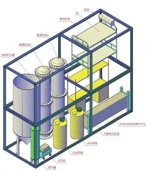 說明:設(shè)備系統(tǒng)可以承受高濁度(1000mg/L)進水和高含油量(1000mg/L)進水。出水仍然可維持在上述指標,但是運行費用會增加。 立體圖示