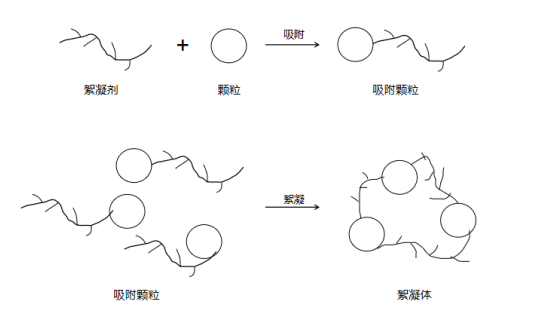 投加水溶性鏈狀高分子聚合物且其能和膠粒及細微懸浮物發生吸附的活性部位,此時它可以通過靜電引力、范德華力和氫鍵等,將微粒搭橋聯結為絮凝體。