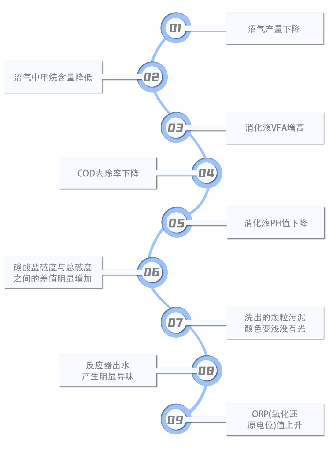 然而,相對于非產甲烷菌而言,產甲烷菌對溫度、pH、氧化還原電位(ORP)、堿度及有毒物質等均很敏感,各種生態因子的生態幅均較窄,對生態因子的要求更加苛刻。所以當系統中溫度、pH、ORP等生態因子或有機負荷劇烈變化時,產甲烷菌的活性會受到一定程度抑制,而非產甲烷菌活性所受的影響較小,其產生的VFA不能全部被產甲烷菌利用,使得厭氧體系內VFA大量積累,兩大類細菌的代謝平衡被破壞。因而溫度、pH、ORP、有機負荷等條件均導致厭氧酸化現象的產生。