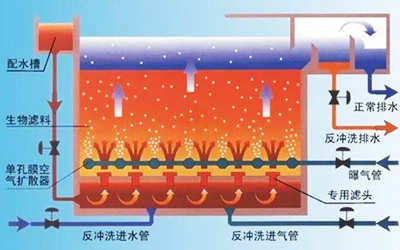 曝氣生物濾池的主要特點是采用粒徑較小的粒狀材料作為濾料,濾料浸沒在水中,利用鼓風機曝氣供氧。濾料層起兩方面作用,一是作為微生物的載體,與一般的生物濾池相比,由于具有更大的比表面積,污水與生物膜實際接觸
